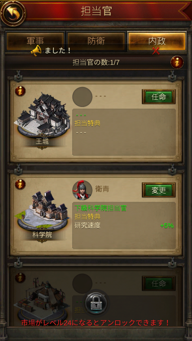 ゲームのレベルが上がってきて、将軍が育ってきたら、科学院の担当官に将軍を配置することで研究の時間が短くなります。