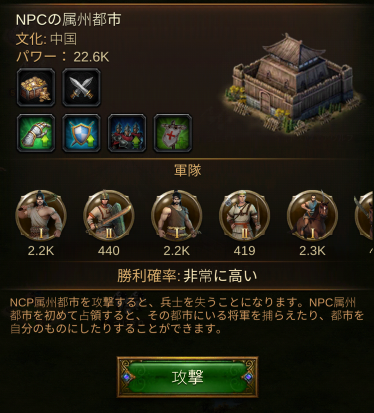 NPCの属州都市は、1度の攻撃で取得できますが、レア以上で誰かが所有している場合は、占拠するプレーヤーが1人で攻撃に10回勝利する必要があるのと、相手の君主や同盟が飛んでくるので、同盟内の複数メンバーと作戦を立ててからゲットしてください。(攻撃はPvPレポートに残り、相手が逆恨みすることもあるので、君主や同盟が誰なのかを確認する必要があります。)