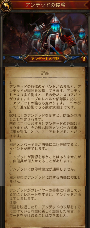 アンデッドの軍隊が同盟の各プレーヤに対して、プレイヤーの城レベルに合わせて、城レベルと同じレベルのアンデッド20隊が3分おきに連続で攻めてきます。[約1時間](※無理して城レベルを上げると完走が難しくなります。)