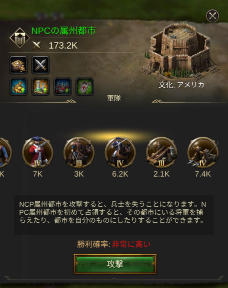 NPC属州都市をタップして、攻撃を選択するとティア2の兵種4の部隊レイヤーになっているのが確認できます。