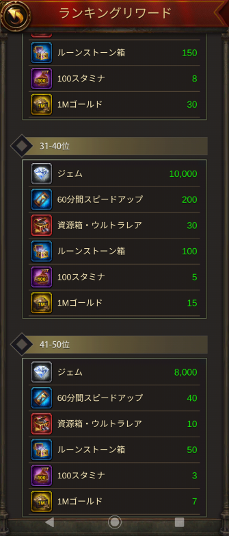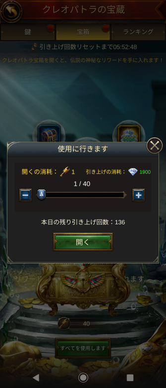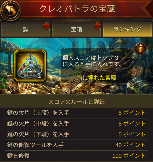 宝箱と交換のおまけもついてますが、ジェムがもったいない人は、鍵修復でランキング50位以内を目指すのもいいかも。