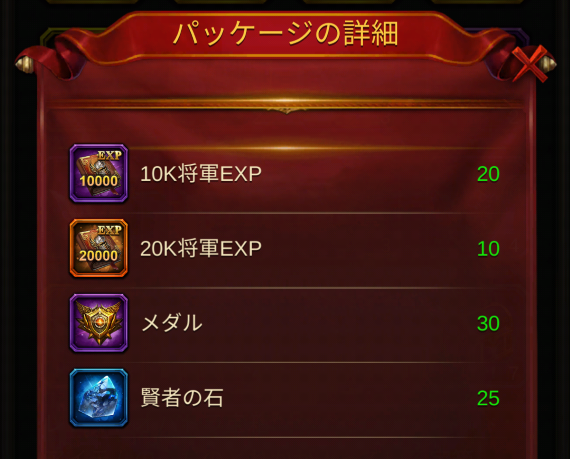 1回の交換で入手できる宝箱は、レア宝箱、ノーマル宝箱、ラグジュアリー宝箱、プレミアム宝箱、歴史の名称(プレミアム)、5Kジェム、ルーンストーン2500個。
